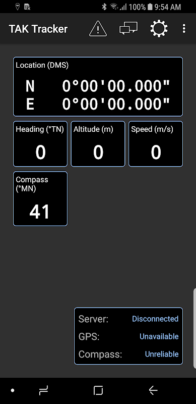 • When TAK Tracker opens for the first time, invalid connection settings will show at the Server line on the bottom right.