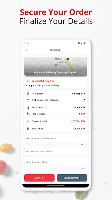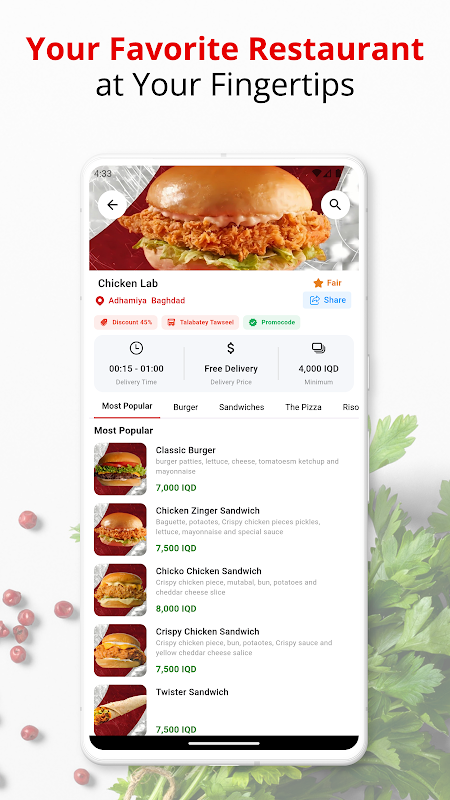 By using Talabatey application, you will be able to order any type of food you like from more than 1000 restaurants in Iraq and Sudan and in Syria.