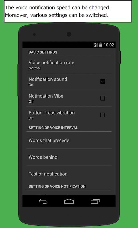 * Voice notification rate is Android4.0 or more.(Less than Android4.0 is in the Android terminal setting, Change in the "Text-to-speech settings".)