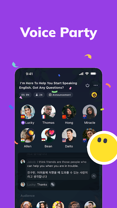 The voice-only space feels natural: no camera, no stress, just voices that create real connections. Real-time subtitles and free translation help everyone participate effortlessly, no matter your language.