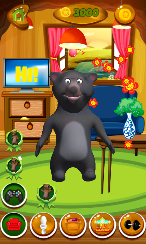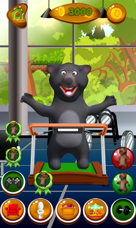 Play the best talking bear game and take a look at his beautifully decorated rooms. This cute animal has his own gym. He can walk or run on the treadmill, and to exercisse with weights, it is important to get fit! He has a beautiful bedroom where he can rest, so turn off the lights when you want the bear to go to sleep. The horn is there to wake him up after the nap! In the latest talking game, your virtual animal can go to the bathroom and take a bath or brush his teeth. He knows to play trumpet, just watch his performance. Tap the vase to see flowers come out, and the balloons will appear if you click on the chandelier. If you open the drawer, little duck will come out. You will enjoy spending time with your cool pet, so do not hesitate and download the popular talking game free of charge! The bear has a fabulous playground, and playing with the ball is his favourite activity so get ready to have some fun. There is a trampoline where he can jump, and he loves spending his time there. Get ready for fabolous mini games. Try all of them and helph your brave hero collect coins and unlock other rooms. Get into Jumpy Bear and just follow your cute pet in endless jumping adventure, there is a lot of platforms to cross. Talk to your virtual friend and he will repeat your words. Play the top talking game and navigate your virtual pet through the daily activities. You can take care of your sweet animal and play this fun and relaxing application that will become your favourite one in no time.