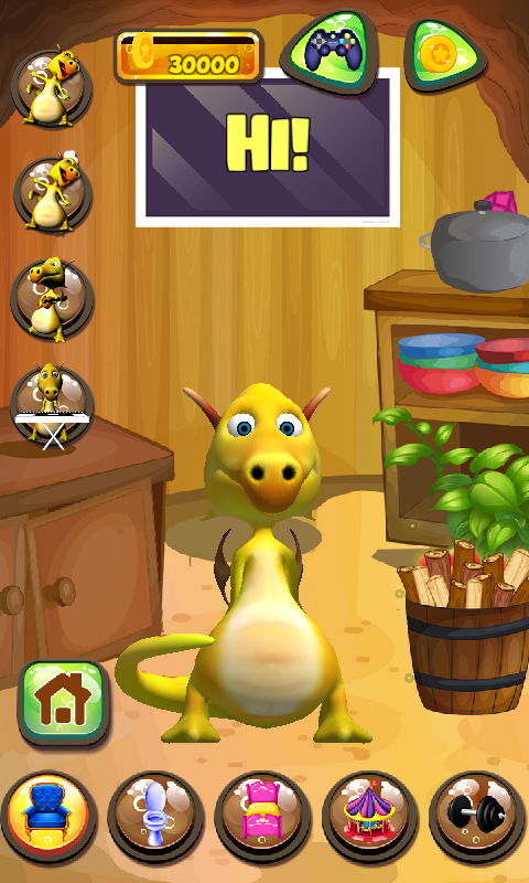 Never again will you be bored while you are waiting in a queue. Your pet from famous folklore stories will keep you company and entertain you. Tap his foot or slap him to make him see stars. If you are feeling down in the mouth, this cute talking dragon will try to cheer you up by playing the guitar or the piano. Your virtual pet is keeping his hygiene, so you will need to assist him brush his teeth and have a shower. Like every other animal, he will also go to the loo. All this talking and playing will get your virtual pet a little bit tired, so you should put him to bed. Turn off the light, or tap the music box and he will be dozing off in no time. When you get enough coins, another room will be unlocked, and the two of you will be able to play outside in the forest. He adores jumping on the trampoline and playing with the ball. What is of high importance to the talking dragon is keeping fit. He wants to be in the best shape and that is why he visits the gym and runs on the treadmill.