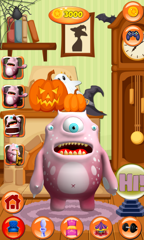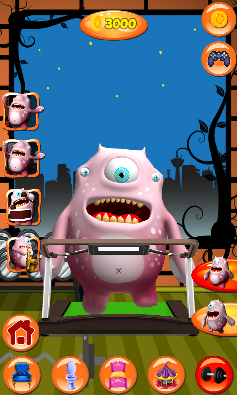 If you collect enough coins, you will unlock the other rooms. Take your monster to the loo, and help him stay clean. He loves taking showers, but you will need to chase him to brush his teeth. One of the things that he never misses is his beauty sleep. All these activities make him extremely tired, so he needs to take his rest. Blow the whistle to turn off the light and to wake him up. His playground is the strangest place. In front of a haunted house is where he adores spending time. With an apparition going around his head, he is jumping on the trampoline and has the time of his life. A healthy way of living is extremely important to the talking monster. He adores exercising, and his favorite machine is a treadmill. No matter if he is running or walking, it is important that he is burning calories.