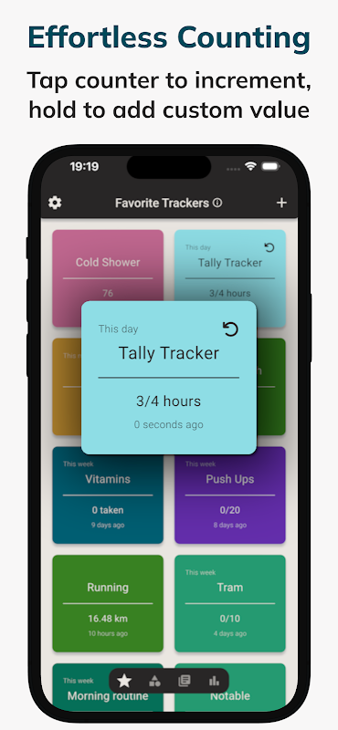 Tally: Counter Clicker Daily is an app that let's you track anything in your life by simple taps. Create beautiful counters in various categories and visualize your data in many forms such as charts, calendar, journal or more! Whether you're trying to track your reps, words, tasks, pills, streaks, points, score, numbers, points, laps, drinks, people, goals, rows or habits: Tally lets you track it easily.