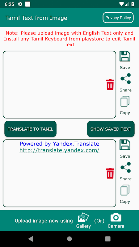 Users can upload the image from Gallery or Camera and get text from it (Tamil Image to Text). Once scanned, Users can