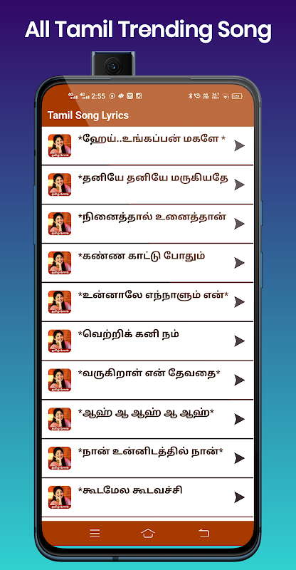 Tamil Song Lyrics app - contains all New Tamil Song Lyrics And Old Tamil Song Lyrics with small details about the song . A native Android application to view lyrics for Tamil Movie Songs. You can find all new songs and old songs by clicking in our tiny Small Search icon. You can even search based on years and movies. All movies listed in our app contain popular songs for now. In few weeks or days we will add complete songs from Each Movies.