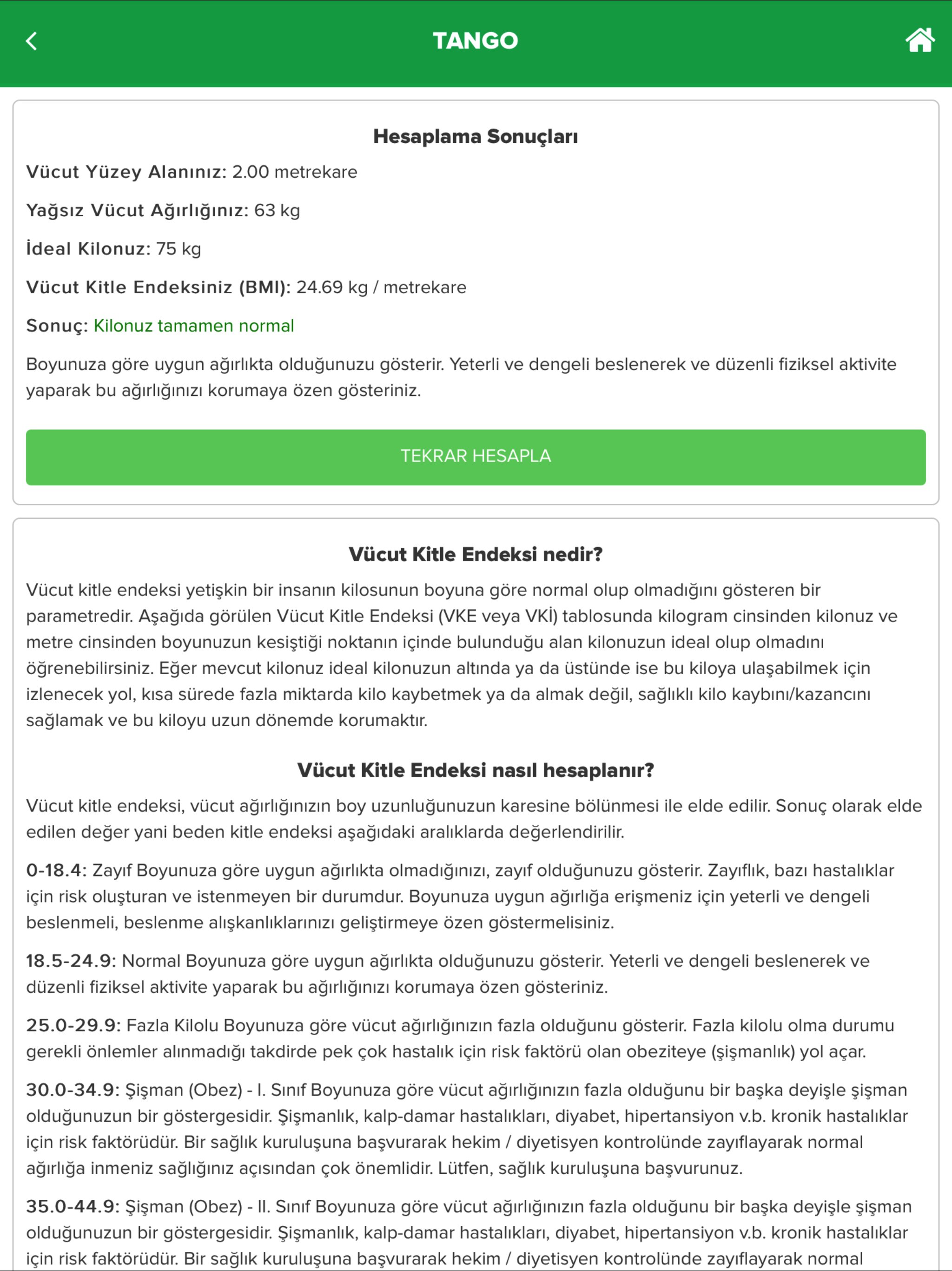 Tango uygulamasıyla vücut kitle endeksinizi hesaplayabilir. Fazla kilolarınızı kontrol edebilirsiniz. Ayrıca Tango uygulaması size günlük su ihtiyacınızı ve ortalama günlük kalori ihtiyacınızı hesaplama imkanı verir.
