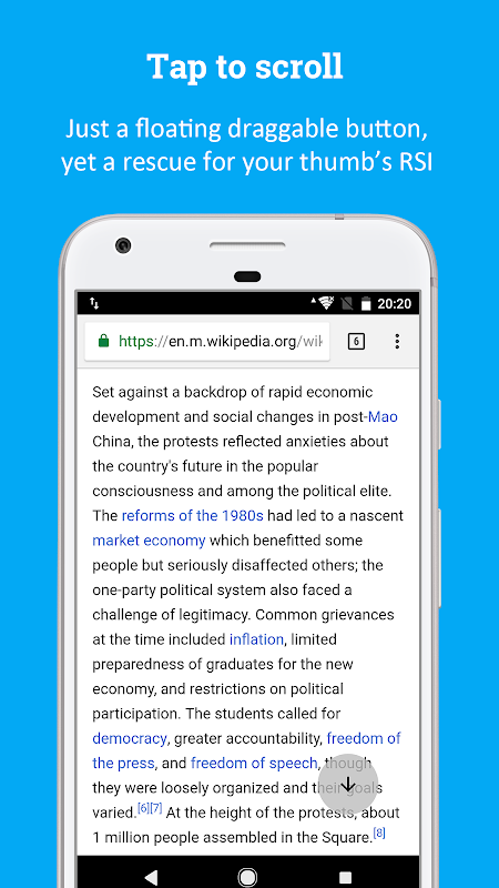 Tap Scroll is a simple app that just for making scroll easier. When running, a floating, draggable button displays on your screen, you can scroll any app just by tapping the button. It's extremely helpful for reading lengthy content, like books, blog posts, IM messages, social network timelines (Twitter, Facebook, Instagram, etc) and so on. With Tap Scroll, you don't need to swipe 10,000 times a day that make your thumb joint sore.