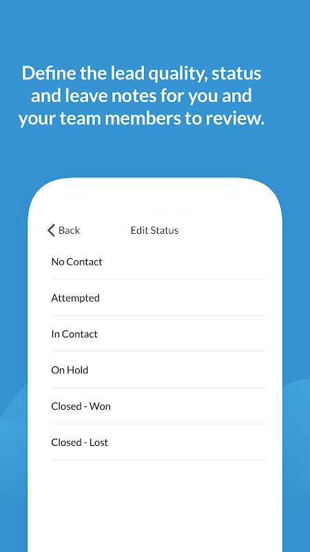 The Leads Management app allows you to manage your leads and see relative information at a glance. Define the lead quality, status and even leave notes for you and your team members to review.