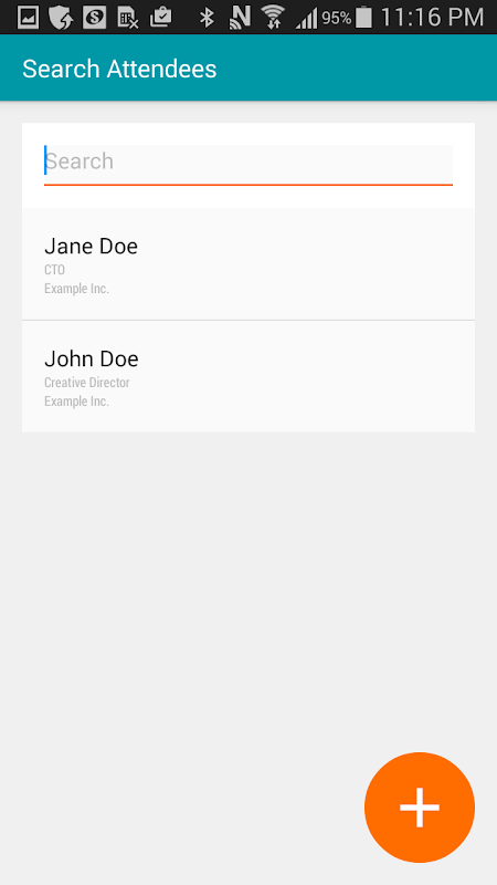 This app is a demo only, it shows users how to program NFC business cards into NFC stickers that can be affixed to name badges. You can manually add attendee names through the app, but it is designed as a demo.