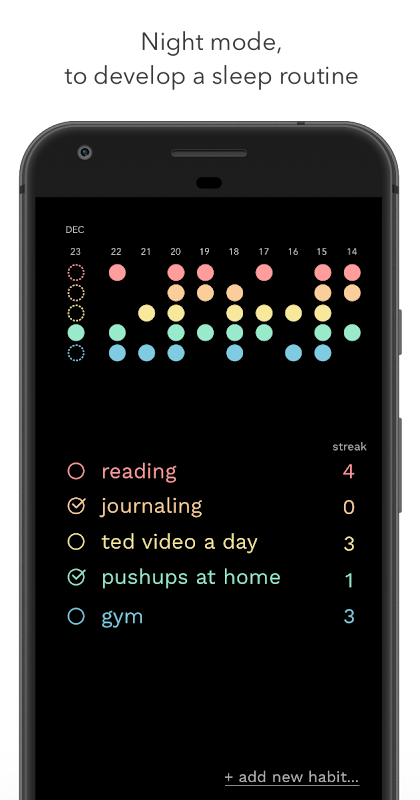 We believe that creating a beautiful habit list will entice each of us to do more of the productive habits we know we should do, but we often aren't reminded enough, to actually do. With this app, you can pick up your phone, feel inspired by your colorful habits, and Task(one)aday.