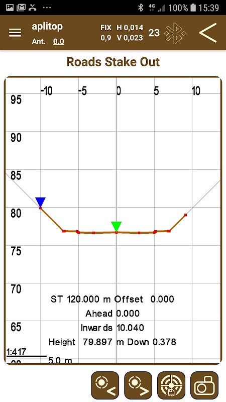 The application allows to perform horizontal alignment staking out and slopes control, getting information in top (using a map as background) and front views. Points or specific vertices (shoulder, sidewalk curbs, roads edges, etcetera) can be staked out in constant intervals with respect to the horizontal alignment,