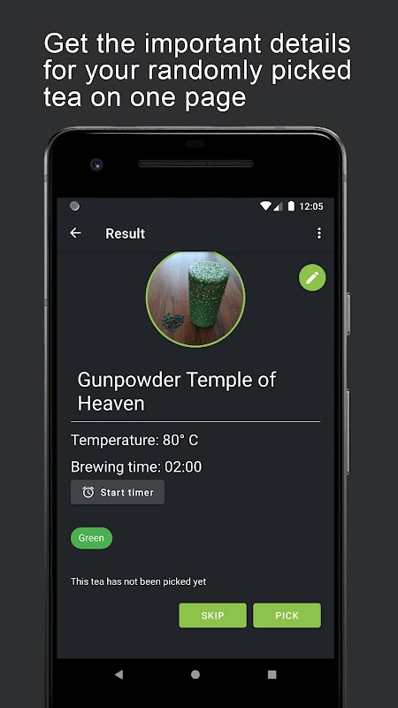 For each tea, you can add your own brewing time in minutes and seconds. When you randomized your tea, you can use the in-app tea timer to know when your tea is ready.
