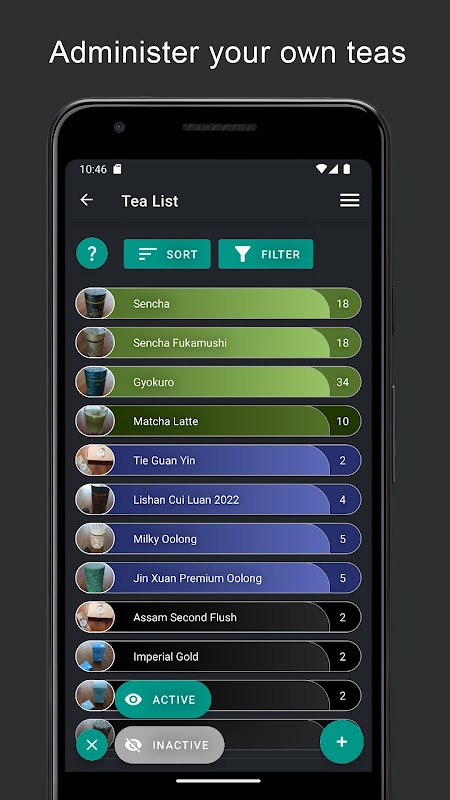 - Shuffle through your teas with customizable filters and shuffle weights.