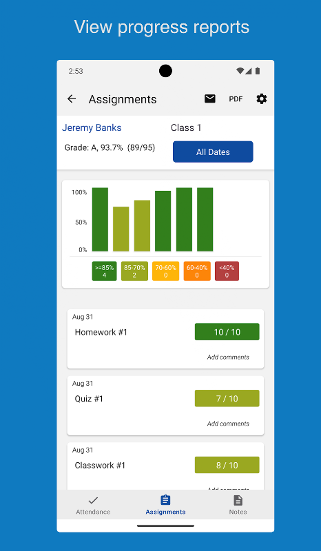 Try the app for free for 30 days with 1 class. A monthly or annual subscription gives teachers access to support up to 10 classes and 6 different semesters. The app is designed for individual teachers to easily manage their classes on a mobile device or computers