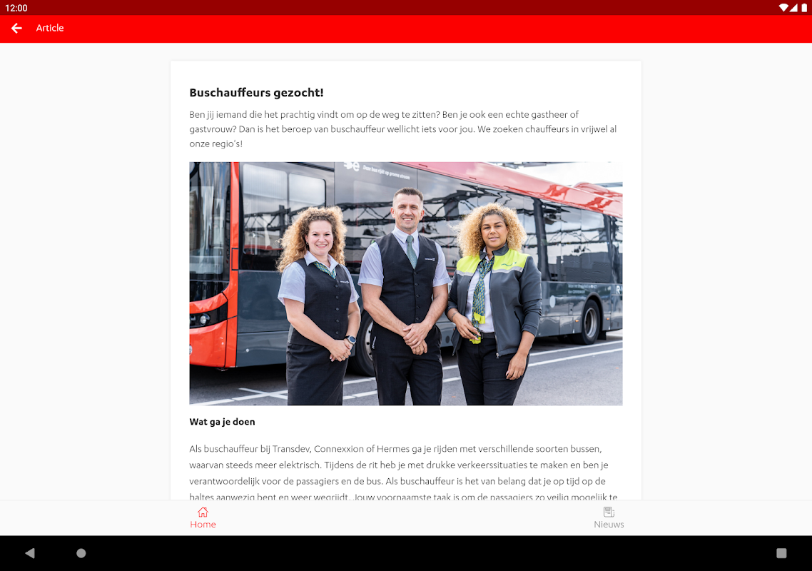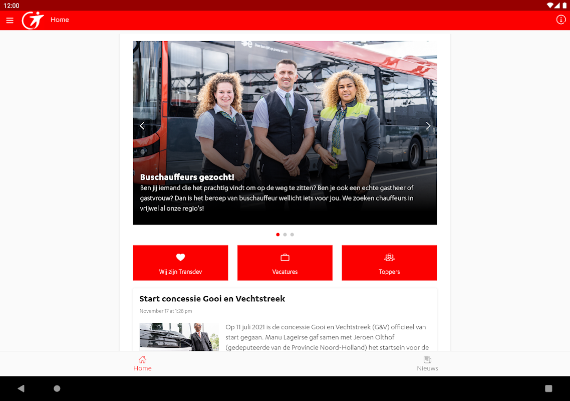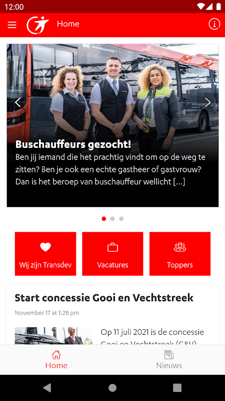 Transdev Nederland is proud to introduce 'Team Transdev'. This smart app keeps you up to date with what's going on at Transdev Nederland - the mobility company. With push notifications on, you never run the risk of missing anything. In addition, the app contains the following functions for users: