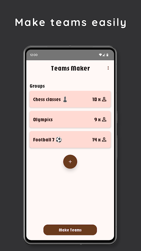 Need to quickly and fairly create teams? Teams Maker is the perfect solution to generate random teams in seconds. Whether for soccer, basketball, volleyball, board games, or any group activity, this app helps you divide players effortlessly.