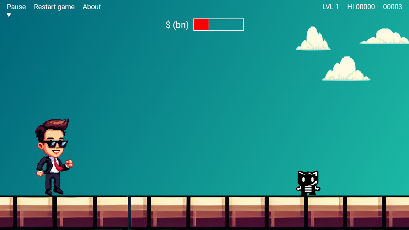 Experience the average day of a tech billionaire by jumping over progress-hating opponents and by getting more money wherever you can!
