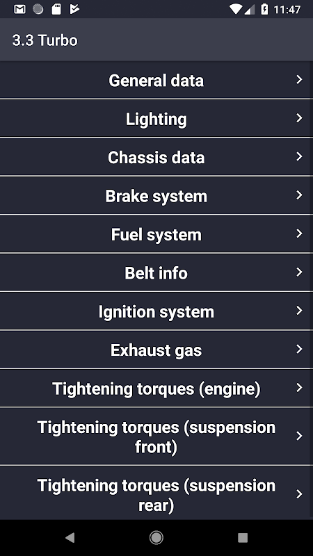 Data is divided into categories: general information, chassis, tightening torques of bolts and nuts, fuel system, brake system, lighting lamps, a replacement intervals and volumes of technical fluids.