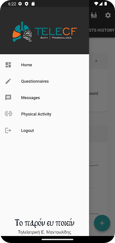 The TeleCF app supports Mandoulides. Through the app, the users can monitor the lung's function, systematic exercise, and the compliance to the daily treatment, which constitute the major factors for the optimal health of patients with cystic fibrosis. The "remote" collection of data via telemedicine, completes health monitoring at the doctor's office and provides valuable information to the doctor in order to modify the patient's care plan. The Tele-CF Auth / Mandoulides program, successfully fulfills this aim.