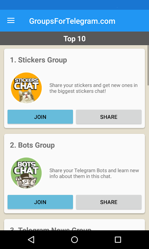 Top 10 Groups for telegram. News, stickers, bots, development, etc.