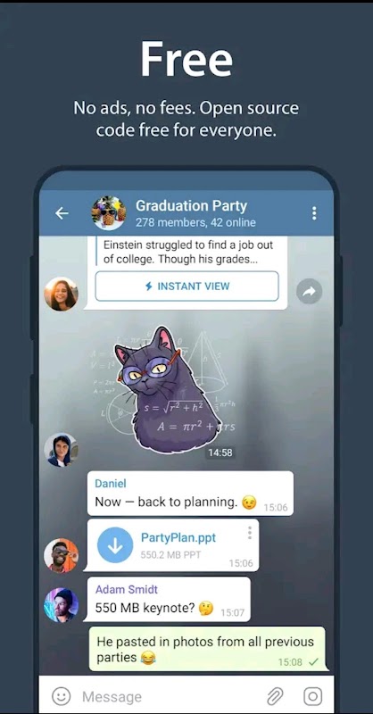 POWERFUL: You can create group chats for up to 30,000 members, share large videos, documents of any type (.DOC, .MP3, .ZIP, etc.), and even set up bots for specific tasks. It's the perfect tool for hosting online communities and coordinating teamwork.