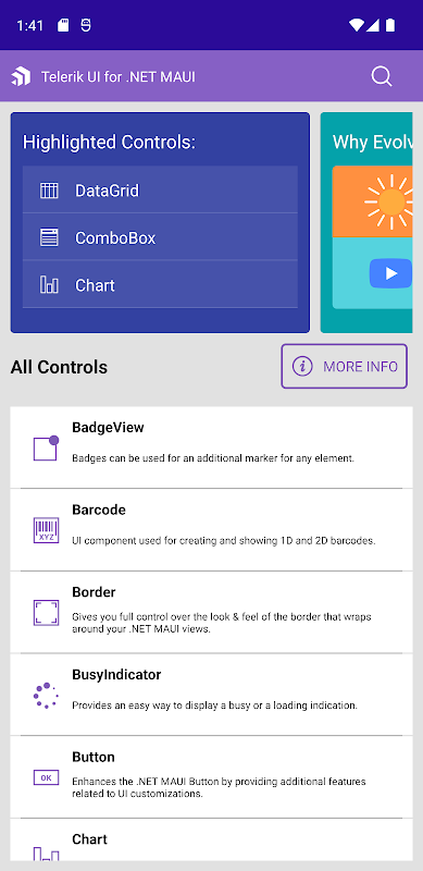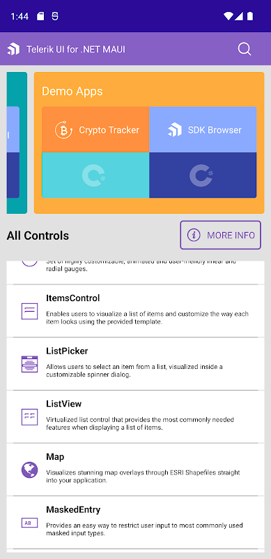 Telerik UI for .NET MAUI is a library of powerful, customizable UI controls with an intuitive API. Use it to build native cross-platform mobile and desktop applications with C# and XAML from a single shared codebase really fast. In this app, you can see in action all 60+ .NET MAUI controls in the library, including: