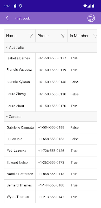 The .NET MAUI DataGrid is a powerful control for easily displaying data in tabular format in your .NET MAUI applications. The control can be populated from various data sources and includes out-of-the-box support for editing, sorting, filtering, grouping, and more. Some powerful DataGrid features include UI virtualization and smooth performance when loading large data sets, single and multiple selection, a built-in styling mechanism for customizing the look of the control and its items, and more.