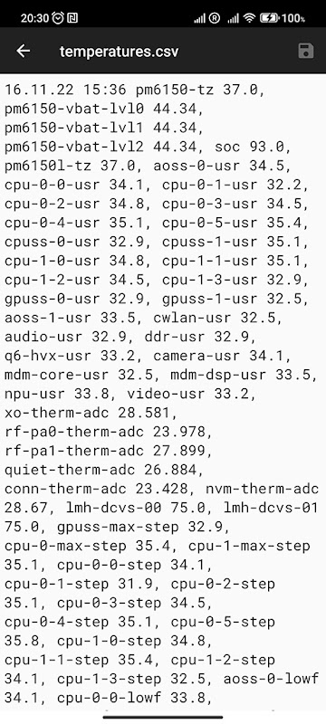 The application receives all available temperatures of the device components and saves them to memory once a second, from where you can save them to a file for further analysis. When you close the application with the monitoring switch turned on, temperature monitoring continues, as you can verify by checking the notification area of the device.