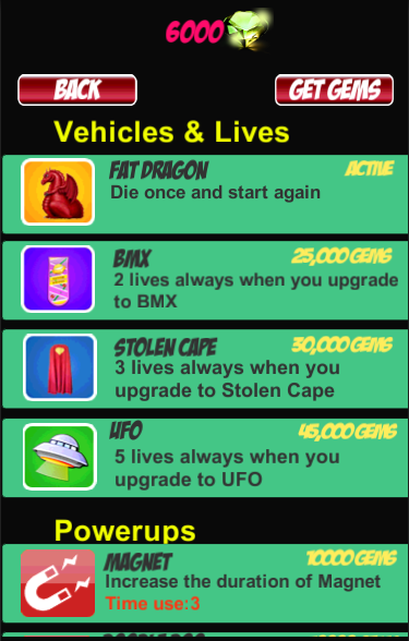 Then you use gems to buy products in store (vehicles, lives, powers up...), try all of their wonder functions.