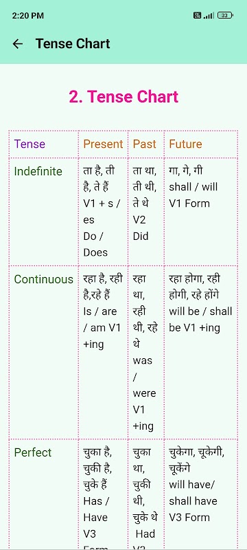 This app includes tense chart; tense rules; tense practice; tense exercise; tense formula; tense quiz; tense question and answer; tense note; tense in Hindi and English; present tense; tense definition; tense present indefinite.