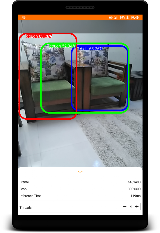 This is a camera app that continuously detects the objects (bounding boxes and classes) in the frames seen by your device's back camera, using a quantized MobileNet SSD model trained on the COCO dataset. These instructions walk you through the building and running the demo on an Android device.