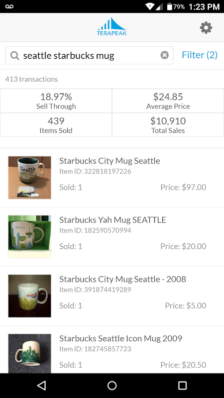 Based on our latest research platform, the new Terapeak Mobile is up to 40x faster than the previous version and offers a cleaner, more modern experience tightly focused on delivering you useful results as quickly as possible with minimum fuss.
