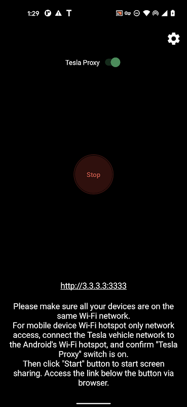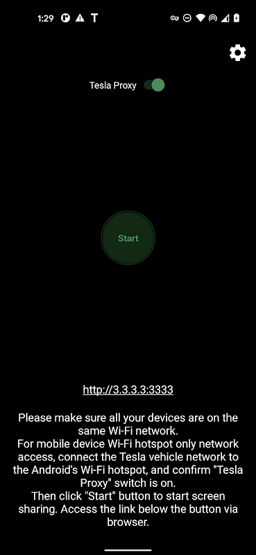 A web server runs locally on your Android device at the virtual IP 100.99.9.9. It is not accessible from the public Internet. Only your Tesla and your phone communicate—there are no intermediary servers. TeslaMirror and its VPN component do not collect any user data or logs, and the app does not redirect or manipulate traffic from other apps.