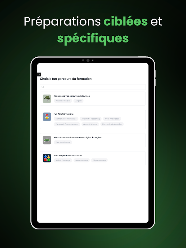 Targeted preparation: Access specific training adapted to the needs of candidates for the French army, the Foreign Legion, the ASVAB and general recruitment tests.