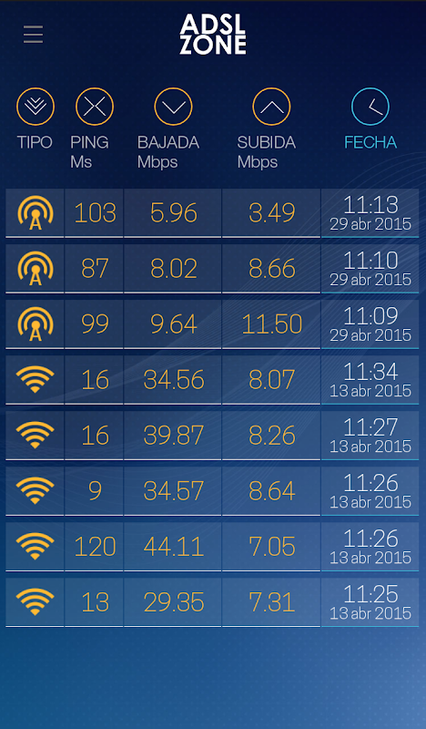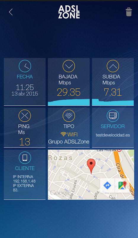 - Geolocalización: al realizar el test de velocidad, se almacena tu ubicación actual junto al resultado para que luego puedas consultar la calidad de la red en esa zona.