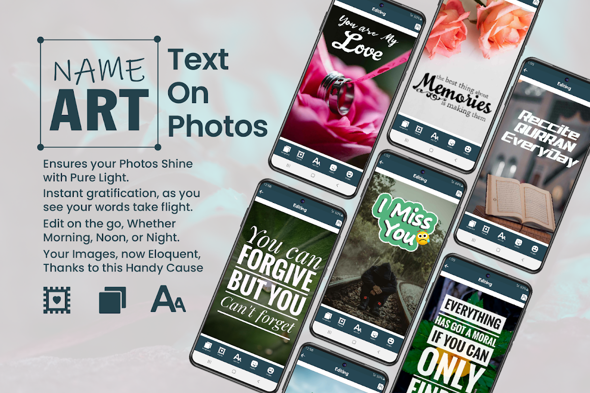 Start using Text Art - Add Text to Photos App a unique photo text editor. The Best Tool to add Text to photos. The Photo Text Editor is a Mobile Application that allows you to add Text to Photos. You can easily add your favorite quotes to any photo. Write on photos with photo text editor!