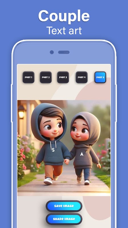 The text art photo editor and name on photo generator app lets you create personalized and artistic text designs photo for dp using your name or any custom text on the given ai photos. The name art generator app will give you stylish photo like boys, girls, couple photos choose from a variety of fonts, styles, and colours to craft unique artworks ai like photos. Express your creativity by adding decorative elements, backgrounds, and effects in just one single click.