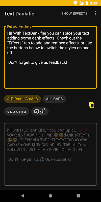 Make text fun! Text Dankifier lets you add various effects to text, like dank text and emoji replacements, aLtErNaTiNg CaPs, s p a c i n g and b̙̐r͖̣͞ŏ̷̖̾k̥̘ế͈̔n͆̍̒.