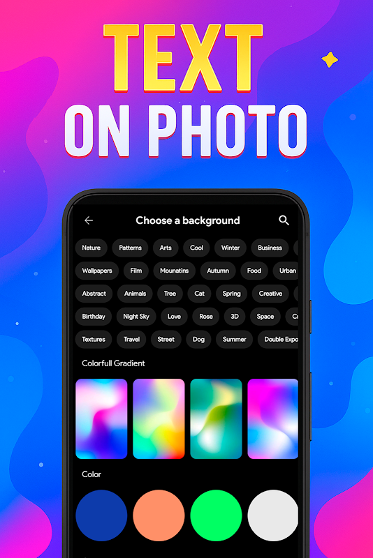 - Beautiful photo backgrounds and fonts from many categories that you can use in your projects. It is also possible to insert images and write text on the photo.