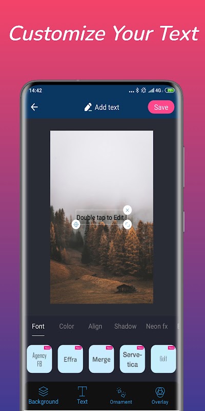 ✔More than 100+ free fonts and font design, multiple text, font size, opacity, color, position, perspective (transform angles), rotation, bold, italic, capitalize, centrations, line spacing and letter spacing, wrap text, shadow, stroke (outline), glow (highlight), flip, mirror. Now you can create thousands of beautiful typography designs for yourself by inserting text on photos.