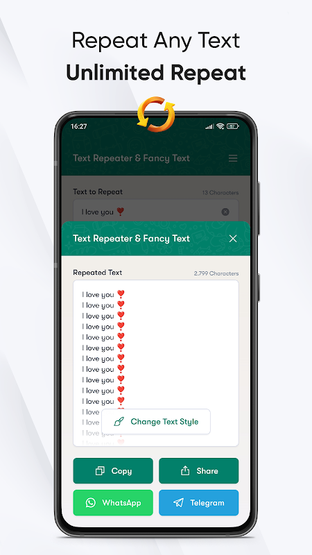 You can choose from 30 different fancy text styles for the repeated text and share it with WhatsApp and Telegram as a fancy text style.