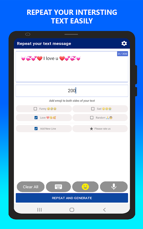 This text repeater app is a simple and easy to use app using which you can easily repeat any of your text or emojis multiple times and share it with your friends on WhatsApp or Instagram easily.