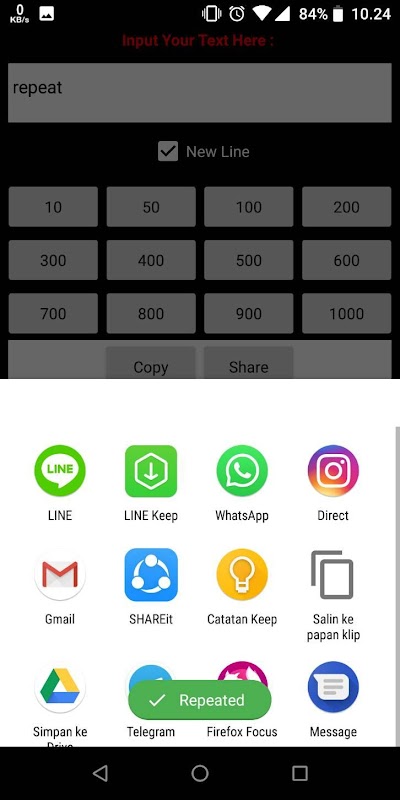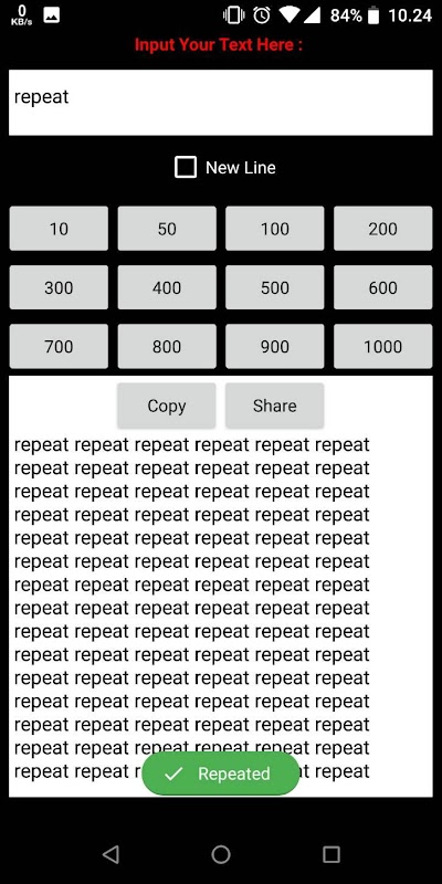 Text Repeater : Repeat It is a app that help you to repeat text as much as you want. You can share in another app. Text repeater is the best choice to you for spam chat your friend.