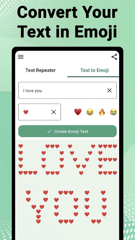 Text Repeater: Repeat Text & Emojis is a funny app that repeat text and convert it into emojis! Whether you wish to repeat text in your message, share text for social media or come up with emoji messages, our application is what you need. In this application you can repeat beautiful love messages and you can convert your text in a emoji letters. With Text Repeater, it has never been easier to repeat text, make use of the text multiplier option and have a text repeater.