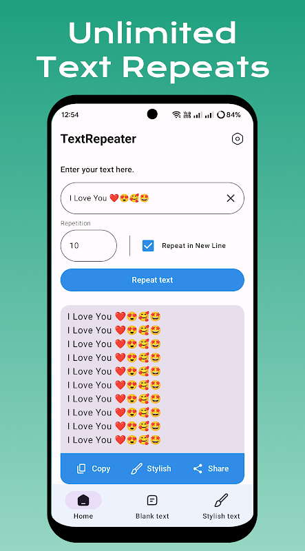 🔄 With Text Repeater: Repeat Text & Emojis app you can repeat text easily, type any text and repeat it immediately. Great to send funny messages and generate repeated words.