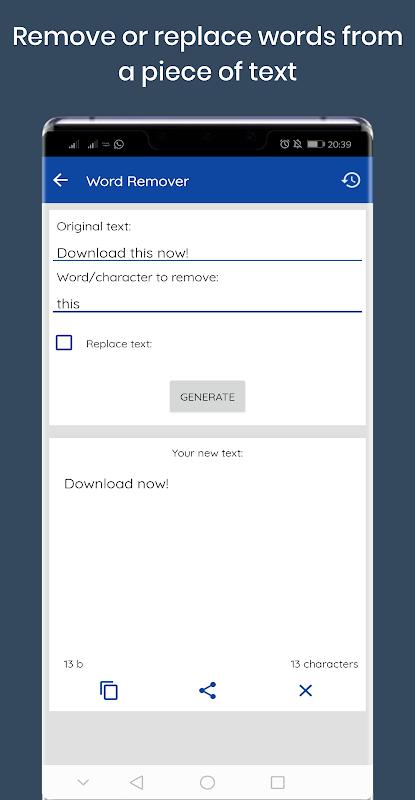 This app includes modes for text repeater, random text generator, word/character remover, cool text styling and morse code. Plenty of modes to keep you entertained!