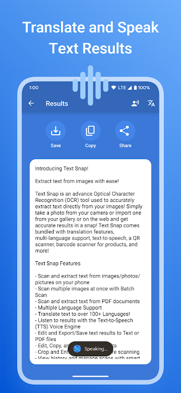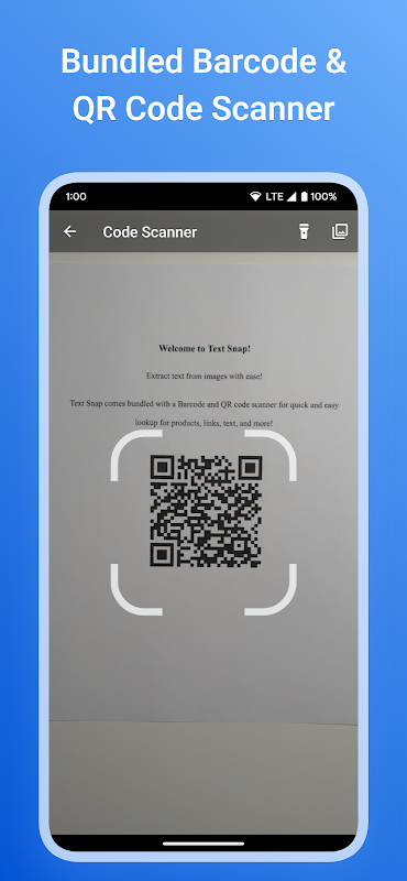 Text Snap is an advance Optical Character Recognition (OCR) tool used to accurately extract text directly from your images! Simply take a photo from your camera or import one from your gallery or on the web and get accurate results in a snap! Text Snap comes bundled with translation features, multi-language support, text-to-speech, a QR scanner, barcode scanner for products, and more!
