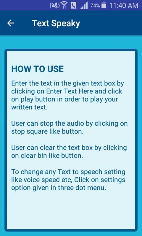 Text speaky is a simple and easy to use 'text-to-speech' app. This app will convert user written text into audio form.