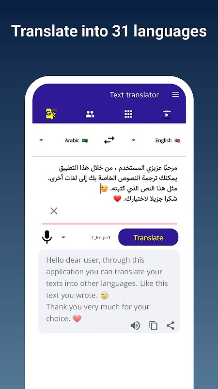 Translate texts into 44 world languages - speech recognition and pronunciation